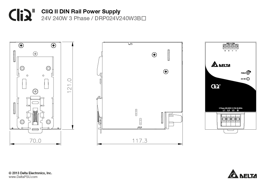 DRP024V240W3BN, Джерело живлення на DIN-рейку, DELTA ELECTRONICS 24В/10А. 3Ф х 320VAC- 600VAC