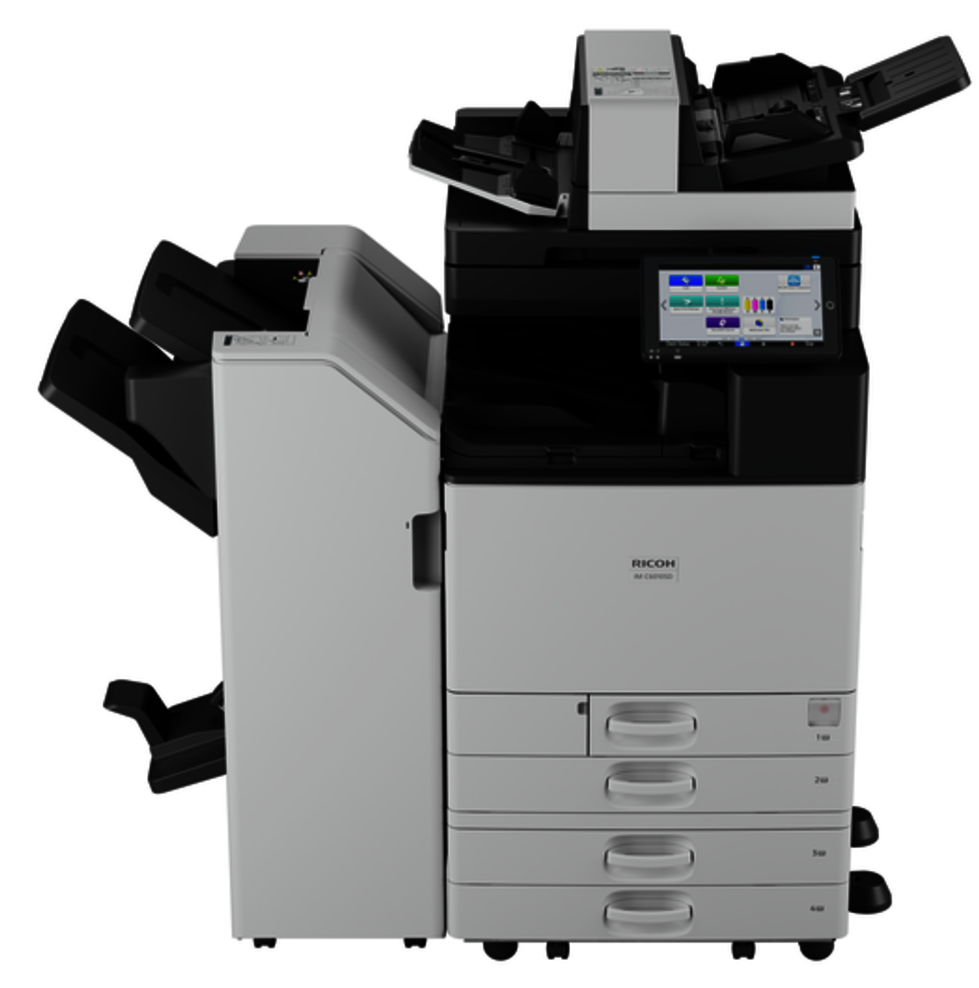 В базі - дуплекс, мережевий гігабітний інтерфейс, завантаження паперу 1,200 аркушів (максимальне завантаження 4,850 аркушів), сенсорна 10,1-дюймова смарт-панель управління.