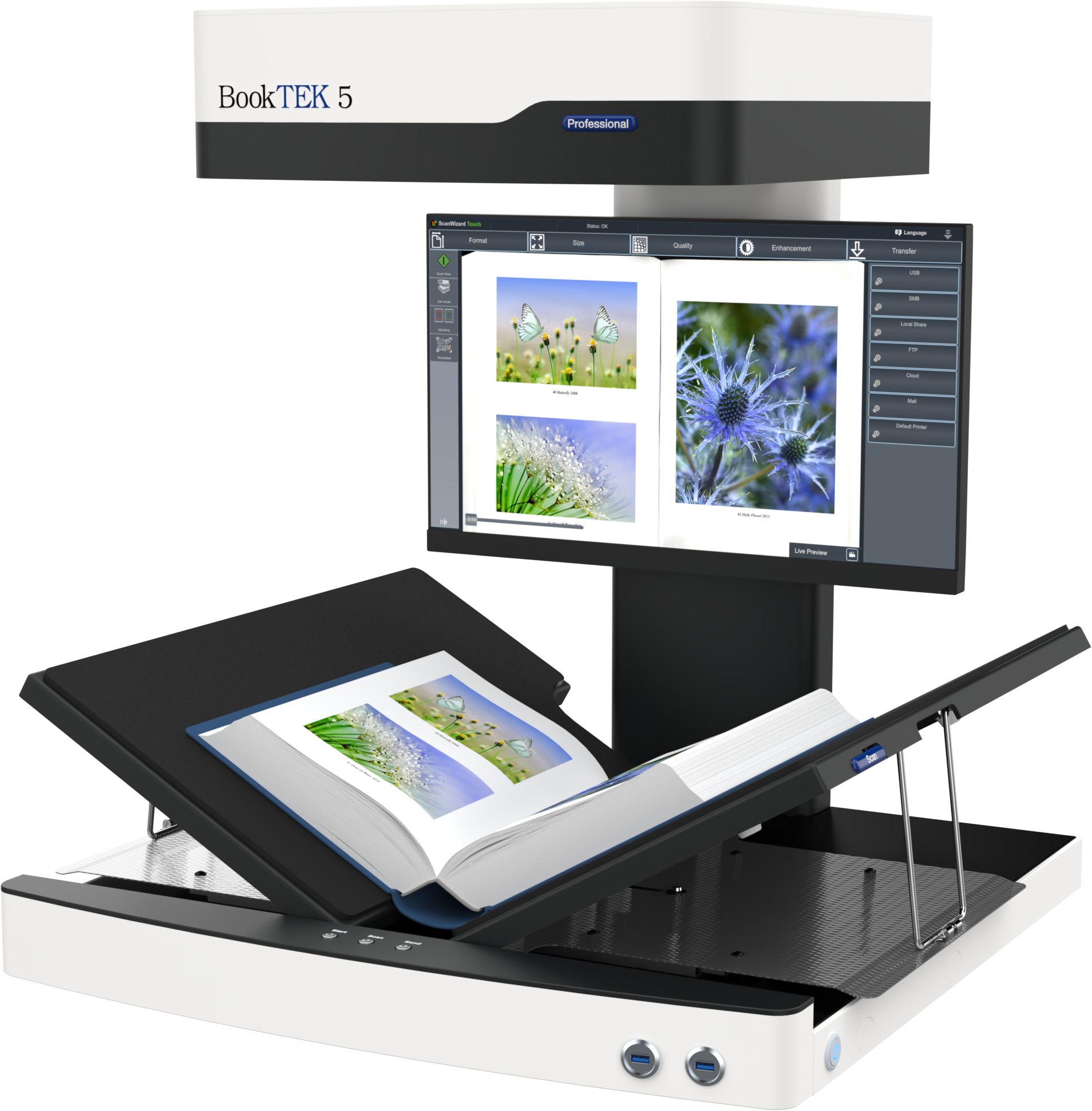 BookTEK® 5 V3 є найменшим з нового покоління екологічно чистих книжкових сканерів, простих в експлуатації. Сканер доступний у базовій (Basic, кіоскній (Kiosk) або професійній (Professional) моделях та є справжнім сканером, а не просто цифровою камерою на дорогій рамі.